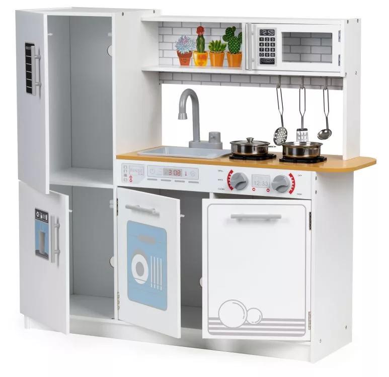 Minden gyerek imádja utánozni a felnőtteket, ennek a konyhának köszönhetően a kicsinek lehetősége lesz szakácsként játszani. A szakács rendelkezésére állnak többek között forgógombos égők a megfelelő hőmérséklet beállításához. A pult alatt sütő és mosogatógép található. A felső részben egy nyitható mikrohullámú sütő és egy további polc található az evőeszközöknek. A konyhában természetesen egy tágas hűtőszekrény is található fagyasztóval és egy hellyel a bevásárlólista felírásához.
