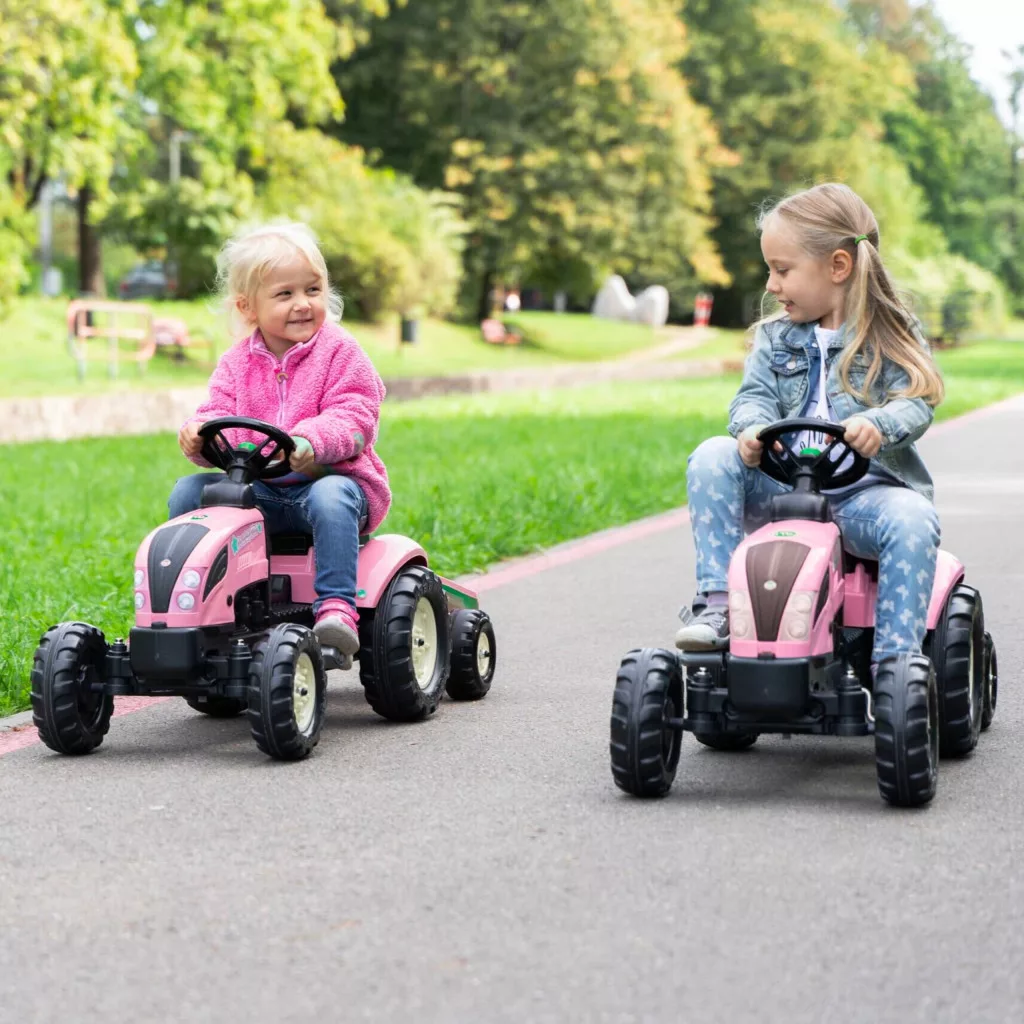 Rózsaszín pedálos traktor utánfutóval